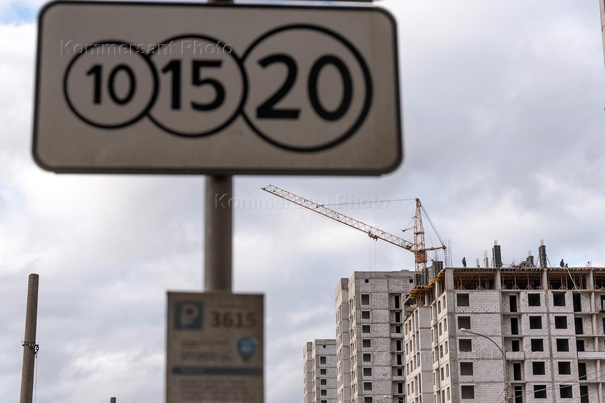 Жанровая фотография. Строящееся многоэтажное здание с кирпичным цоколем.