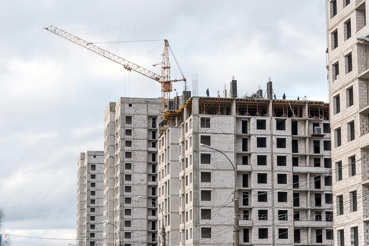 Жанровая фотография. Строящееся многоэтажное здание с кирпичным цоколем.