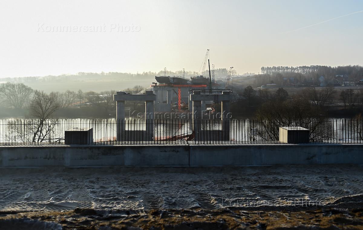 Ход строительства четвертого пускового комплекса Центральной кольцевой автодороги (ЦКАД). Подготовительные работы к монтажу пролетных конструкций нового моста через Москву-реку.