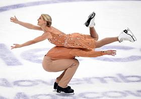 ISU Гран-при "Кубок Ростелеком" - 2019 по фигурному катанию во Дворце спорта "Мегаспорт". Канадские фигуристы Пайпер Гиллес (слева) и Поль Пуарье (справа) во время выступления с произвольной программой.