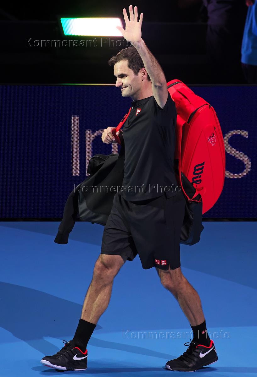 Итоговый турнир ATP (Association of Tennis Professionals). Швейцарский теннисист Роджер Федерер перед началолм матча с греческим теннисистом Стефаносом Циципасом.