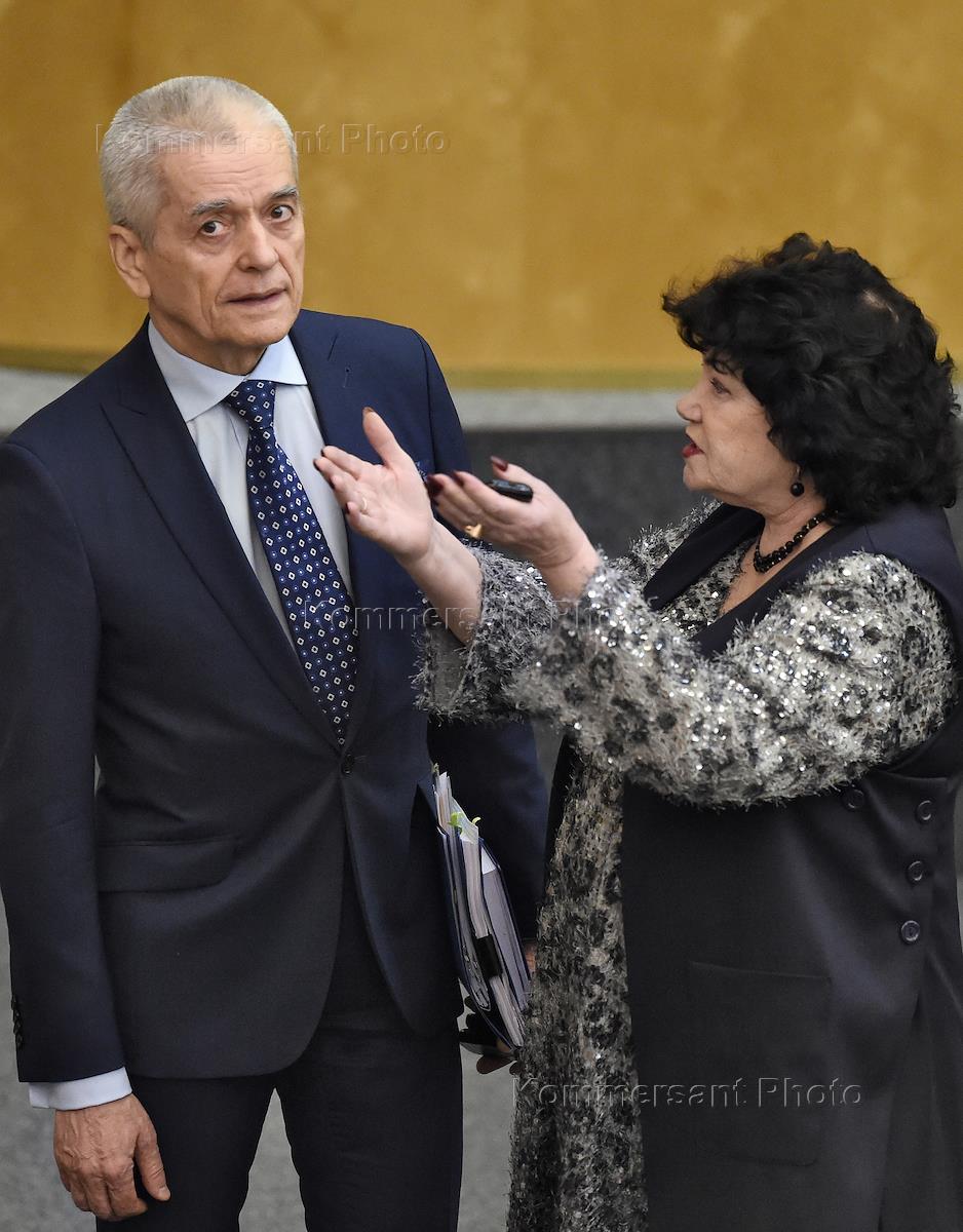 Пленарное заседание Государственной думы (ГД) России. Первый заместитель председателя комитета ГД по образованию и науке Геннадий Онищенко (слева) и председатель комитета ГД по вопросам семьи, женщин и детей Тамара Плетнева (справа) перед началом заседания.