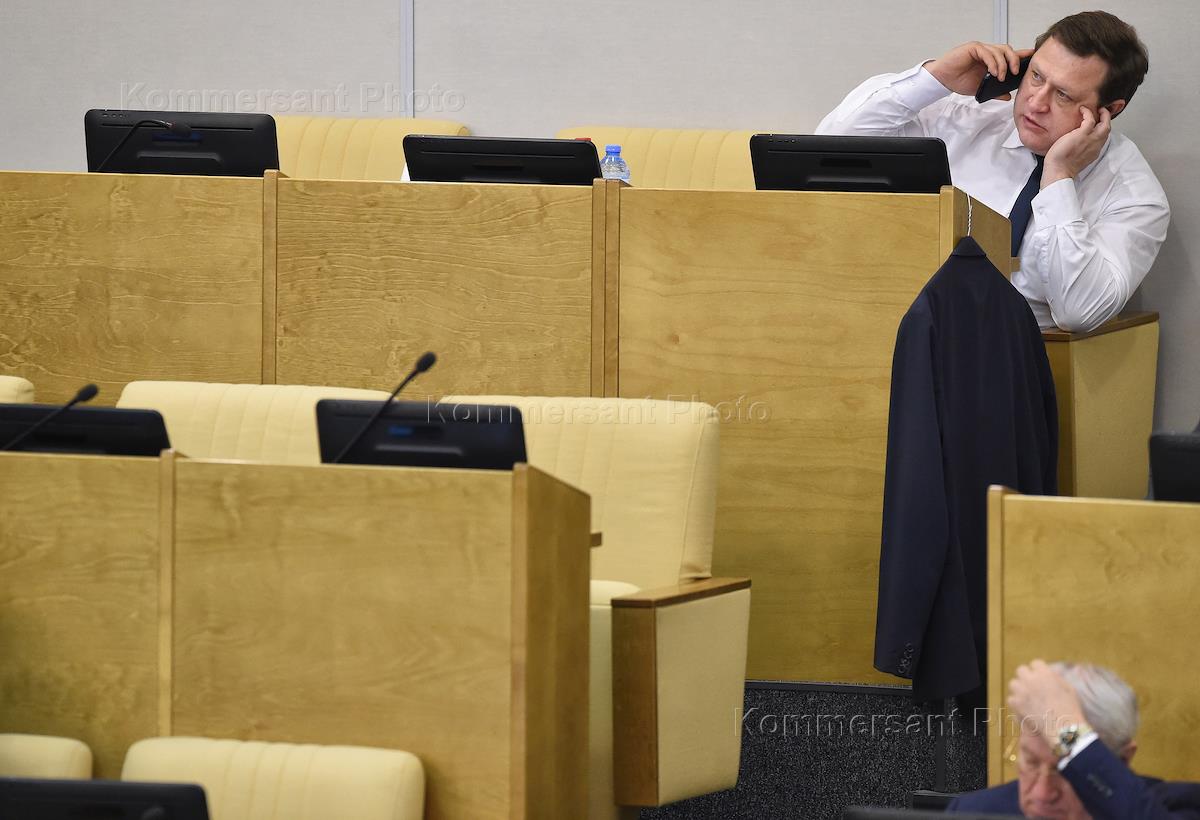 Пленарное заседание Государственной думы (ГД) России. Член комитета ГД России по бюджету и налогам Дмитрий Юрков перед началом заседания.