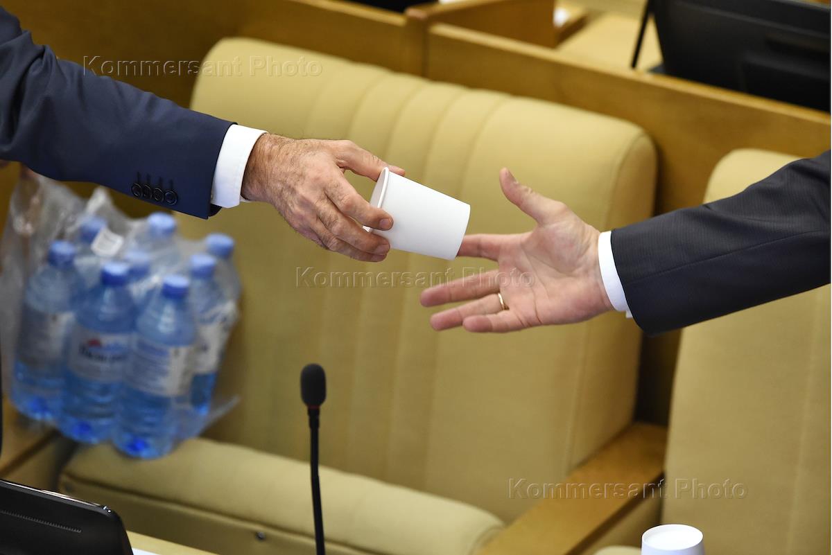 Пленарное заседание Государственной думы (ГД) России. Жанровая фотография. Мужчины передают друг другу пластиковый стаканчик.