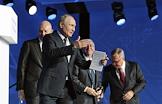 XI Инвестиционный форум ВТБ Капитал "Россия зовет!" в Центре международной торговли. Председатель правления Банка ВТБ Андрей Костин (слева) и президент России Владимир Путин (справа) во время пленарного заседания "Мосты над волнами деглобализации".