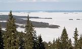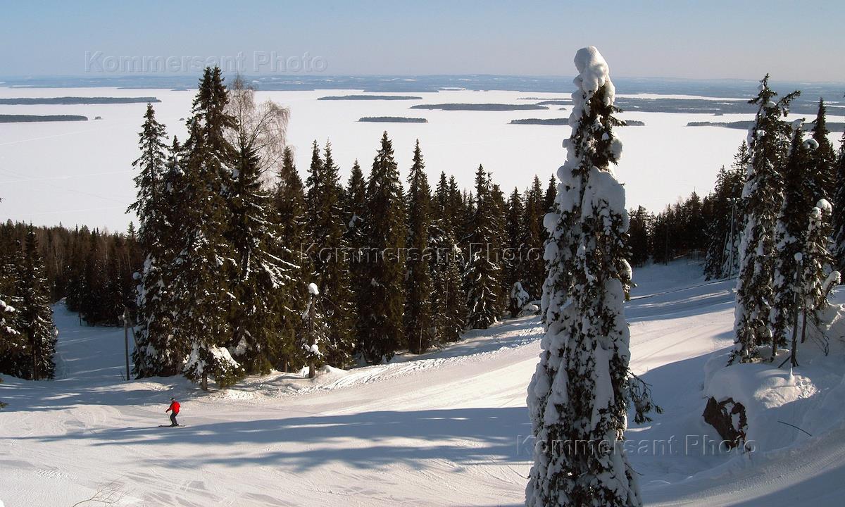 Жанровая фотография. Зимний отдых в Финляндии. Люди катаются на горных лыжах по горному склону.