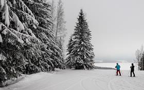 Жанровая фотография. Зимний отдых в Финляндии. Люди катаются на лыжах по снежному лесу.