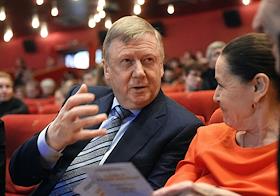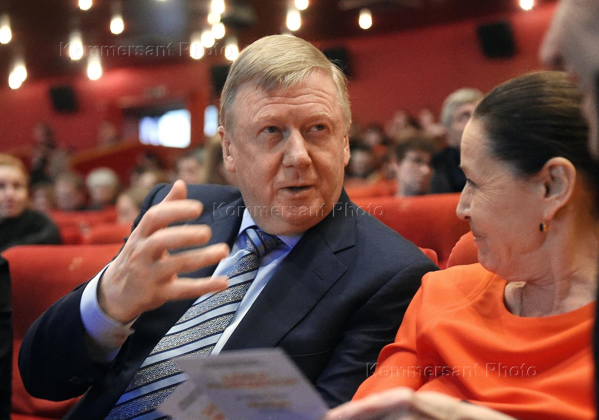 Премьера дебютной комедии Анны Пармас "Давай разведемся!" в в кинотеатре "Каро 11 Октябрь". Председатель правления ООО "УК "РОСНАНО", председатель правления Фонда инфраструктурных и образовательных программ (ФИОП) Анатолий Чубайс (слева) и актриса Елена Прудникова на премьере.