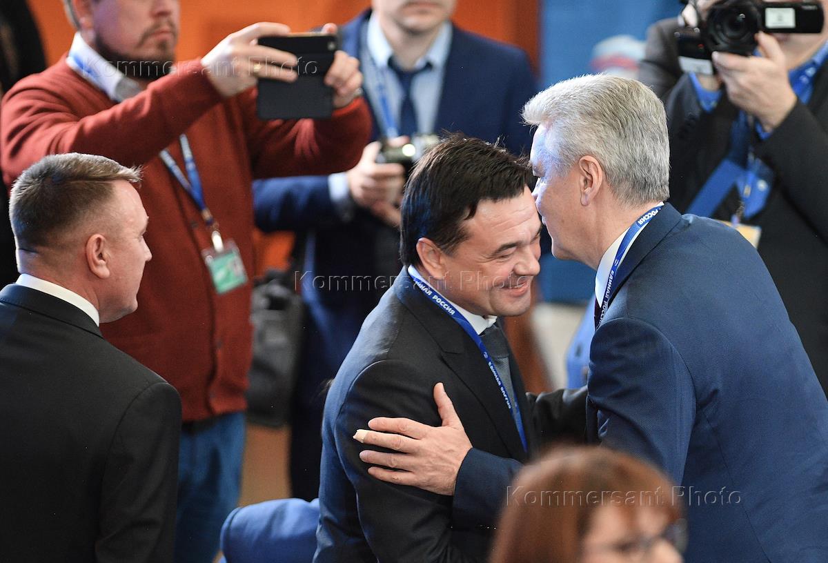 XIX Congress of the United Russia party at VDNH. Governor of the Moscow Region Andrey Vorobyov (center) and Moscow Mayor Sergei Sobyanin (right) during the Congress.