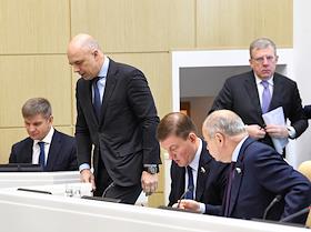 Пленарное заседание Совета Федерации (СФ) России. Первый заместитель председателя правительства России - министр финансов России Антон Силуанов (второй слева), заместители председателя СФ России Андрей Турчак (в центре), Ильяс Умаханов (второй справа) и председатель Счетной палаты России Алексей Кудрин (справа) во время заседания.