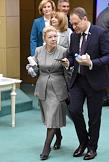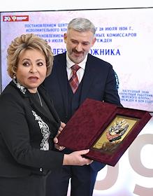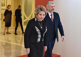 Пленарное заседание Совета Федерации (СФ) России. Председатель СФ России Валентина Матвиенко (слева) и министр транспорта России Евгений Дитрих (справа) перед началом заседания.