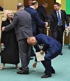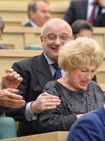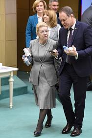 Пленарное заседание Совета Федерации (СФ) России. Зал заседаний. Представитель от исполнительной власти Омской области Елена Мизулина (слева) и представитель в СФ России от исполнительного органа государственной власти Еврейской автономной области Ростислав Гольдштейн (справа) перед началом заседания.