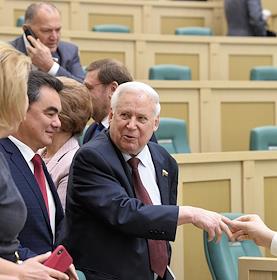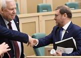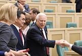 Пленарное заседание Совета Федерации (СФ) России. Представитель в Совете Федерации России администрации Белгородской области Николай Рыжков (в центре) и председатель комитета СФ России по международным делам Константин Косачев (справа) перед началом заседания.