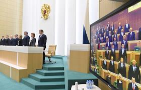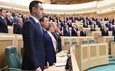 Пленарное заседание Совета Федерации (СФ) России. Члены СФ России во время исполнения Государственного Гимна России во время заседания.