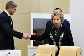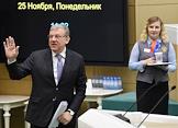 Пленарное заседание Совета Федерации (СФ) России. Глава Удмуртской Республики Александр Бречалов (в центре) перед началом заседания.