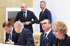 Пленарное заседание Совета Федерации (СФ) России. Первый заместитель председателя правительства России - министр финансов России Антон Силуанов (слева) и полномочный представитель правительства России в СФ России Андрей Яцкин (справа) перед началом заседания.