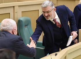 Пленарное заседание Совета Федерации (СФ) России. Представитель в СФ России от исполнительного органа государственной власти Архангельской области Виктор Павленко (слева) и представитель в СФ России от исполнительного органа государственной власти Рязанской области Олег Ковалев (в центре) перед началом заседания.