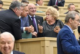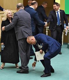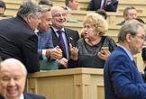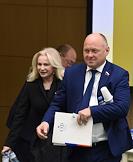Пленарное заседание Совета Федерации (СФ) России. Представитель в СФ России от исполнительной власти Республики Крым Ольга Ковитиди (слева) и представитель от исполнительного органа государственной власти Краснодарского края Алексей Кондратенко (в центре) перед началом заседания.