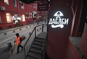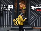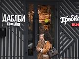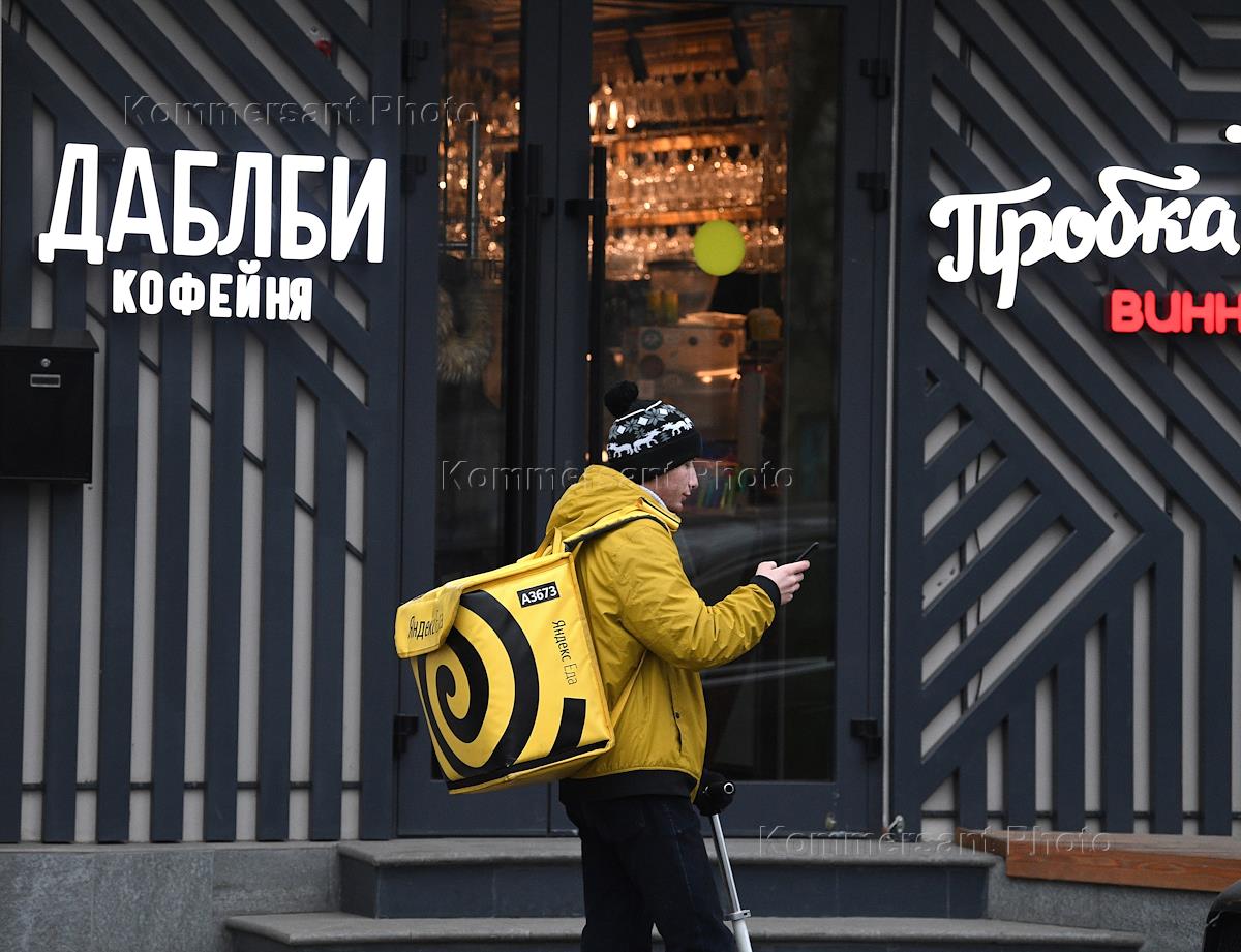 Жанровая фотография. Кофейня Даблби (Double-B). Вход в кофейню. Курьер службы доставки еды "Яндекс Еда" идет по улице мимо кафе.
