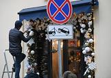 Жанровая фотография. Кофейня Даблби (Double-B). Новогоднее украшение витрины кафе. Дорожный знак "Остановка запрещена" и "Работает эвакуатор".