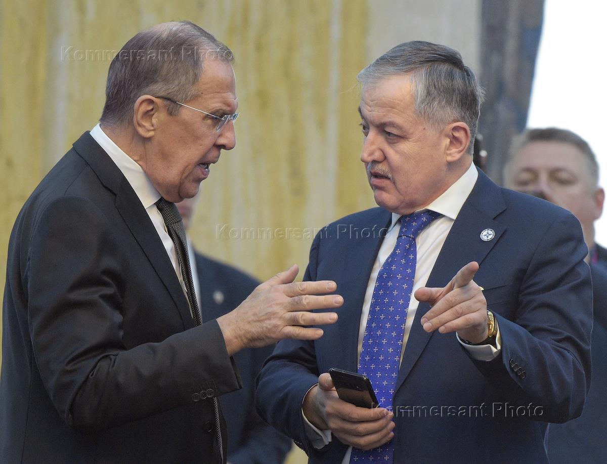 Рабочая поездка президента России Владимира Путина в Бишкек. Министр иностранных дел России Сергей Лавров (слева) перед началом заседания Совета коллективной безопасности "Организации Договора о коллективной безопасности" (ОДКБ) в расширенном составе. Заседание прошло в государственной резиденции "Ала-Арча".