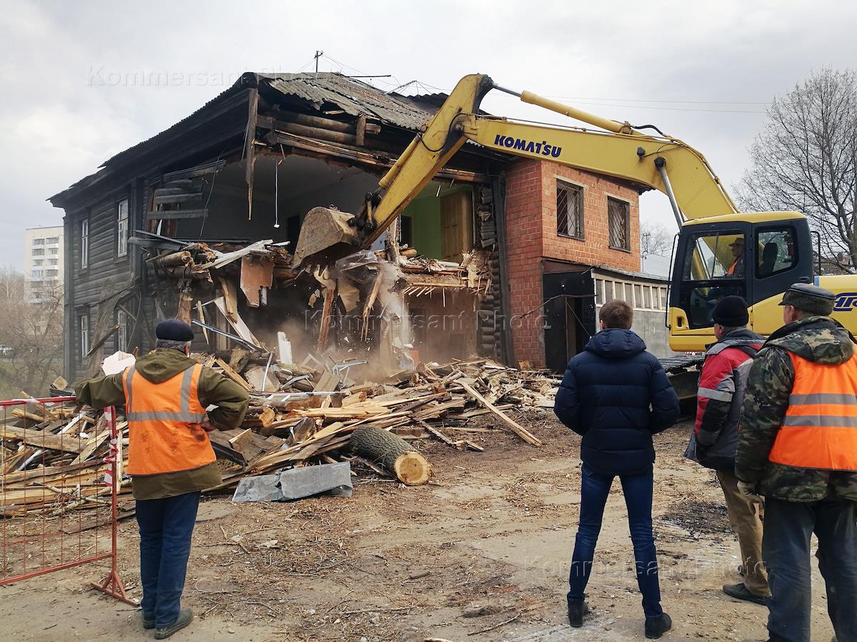 Genre photo. Demolition of an unsafe house; a water leak that occurred earlier in the house's basement caused a landslide on Pokhvalinsky descent.