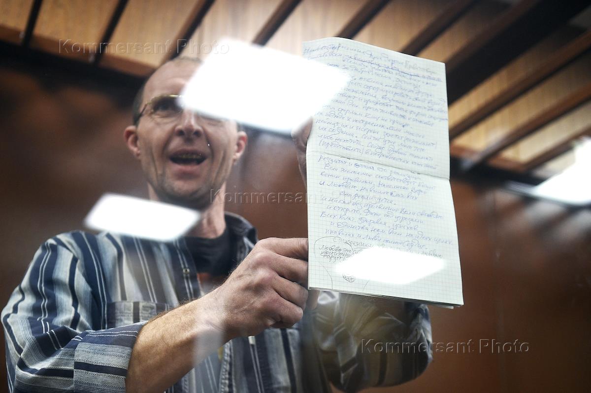 Рассмотрение по существу дела в отношении Эдуарда Малышевского, обвиняемого в применении насилия в отношении представителя власти на несанкционированной акции протеста 27 июля в Москве, в Тверском районном суде. Обвиняемый Эдуард Малышевский во время заседания суда.