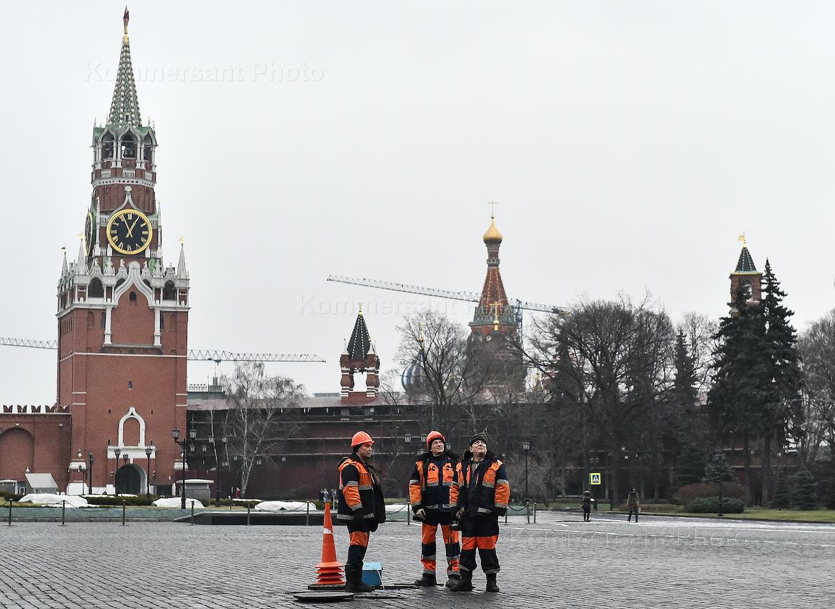 Жанровая фотография. Сотрудники коммунальных служб у люка на Красной площади.