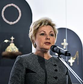 Пресс-показ выставки "Петр. Первый. Коллекционер, исследователь, художник" в выставочных залах Патриаршего дворца и Успенской звонницы Государственного историко-культурного музея-заповедника "Московский Кремль". Генеральный директор Государственного историко-культурного музея-заповедника "Московский Кремль" Елена Гагарина во время пресс-показа.