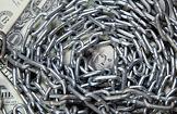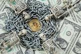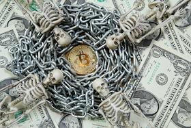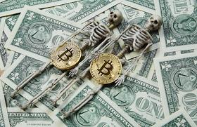 Жанровая фотография. Купюры американские доллары, фигурки скелетов и биткоины.