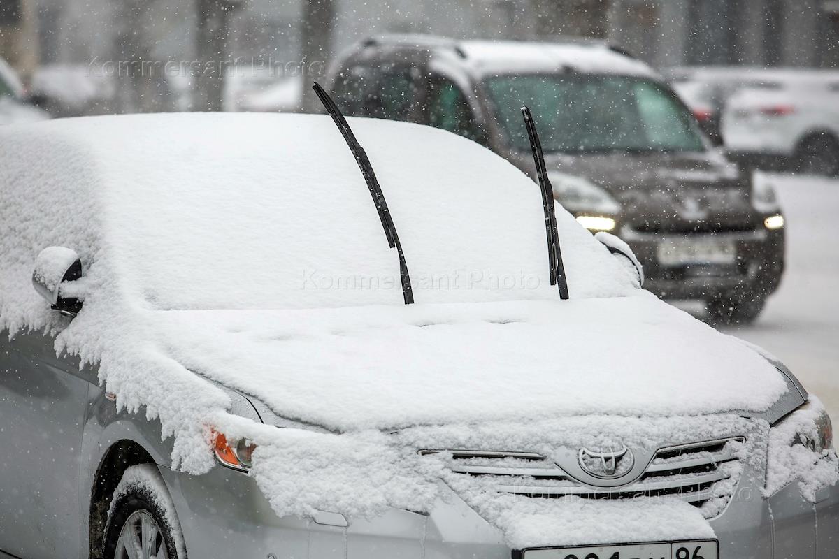 Снегопад в Екатеринбурге. Жанровая фотография. Заснеженные автомобили. Поднятые дворники на лобовом стекле автомобиля "Тойота".