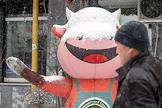 Снегопад в Екатеринбурге. Жанровая фотография. Надувная фигура коровы перед входом в фермерский магазин.