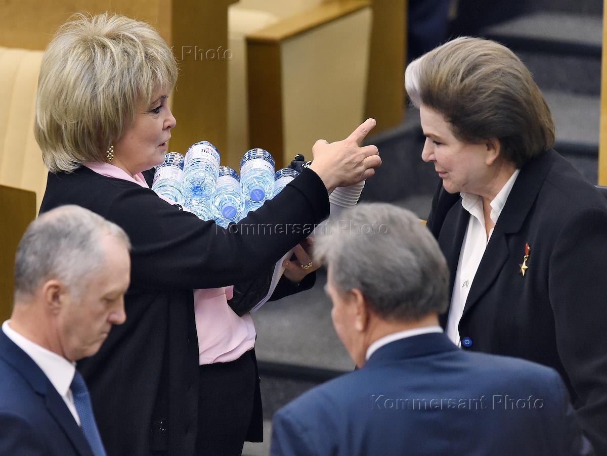 Пленарное заседание Государственной Думы (ГД) России. Член Комитета ГД России по контролю и Регламенту Ирина Марьяш (слева) и заместитель председателя комитета ГД России по федеративному устройству и вопросам местного самоуправления Валентина Терешкова (справа) перед началом заседания.