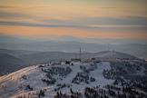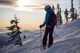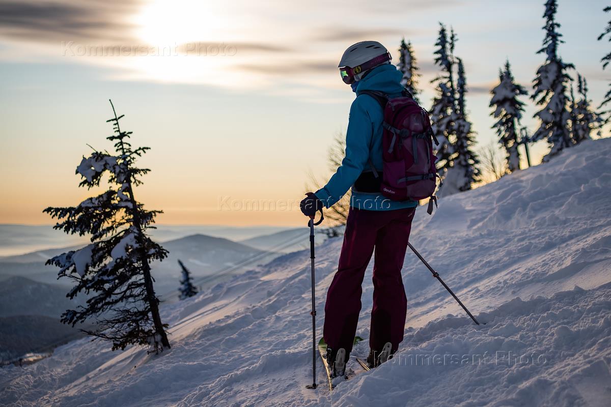 Виды горнолыжного курорта Шерегеш. Жанровая фотография. Лыжник любуется закатом на горнолыжной трассе на горе Зёленая.