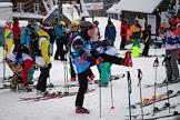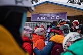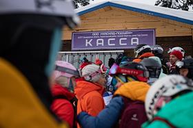 Виды горнолыжного курорта Шерегеш. Жанровая фотография. Очередь на подъёмник на горнолыжной трассе на горе "Зёленая"
