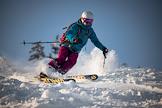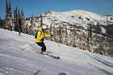 Виды горнолыжного курорта Шерегеш. Жанровая фотография. Лыжник спускается по горнолыжной трассе на горе Зёленая.
