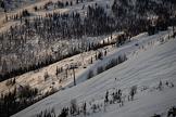 Виды горнолыжного курорта Шерегеш. Жанровая фотография. Лыжники спускается по горнолыжной трассе на горе Зёленая.
