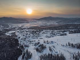 Жанровые фотографии. Виды горнолыжного курорта и одноименного посёлка Шерегеш, Кемеровской области. Горнолыжная трасса. Отель