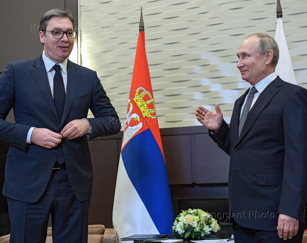 ussian President Vladimir Putin's working visit to Sochi. President of Serbia Aleksandar Vucic (left) and Russian President Vladimir Putin (right) during the meeting at the Bocharov Ruchei residence.