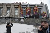 Снос здания киноцентра "Соловей на Красной Пресне". Жанровая фотография. Афиша "Теперь соловей поет в Октябре".