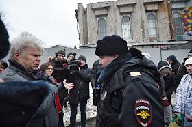 Снос здания киноцентра "Соловей на Красной Пресне". Пикет жителей против сноса киноцентра. Председатель Московского регионального отделения партии "Яблоко", депутат Московской городской думы Сергей Митрохин (слева) на пикете жителей города против сноса киноцентра.