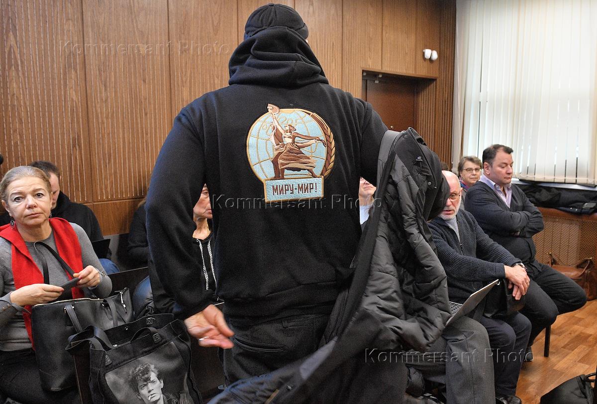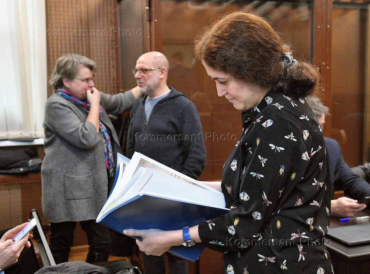 Рассмотрение дела "Седьмой студии" в Мещанском районном суде. Директор Российского Академического Молодежного театра (РАМТ) Софья Апфельбаум (вторая справа) и бывший директор "Гоголь-центра" Алексей Малобродский (в центре) перед началом заседания суда.