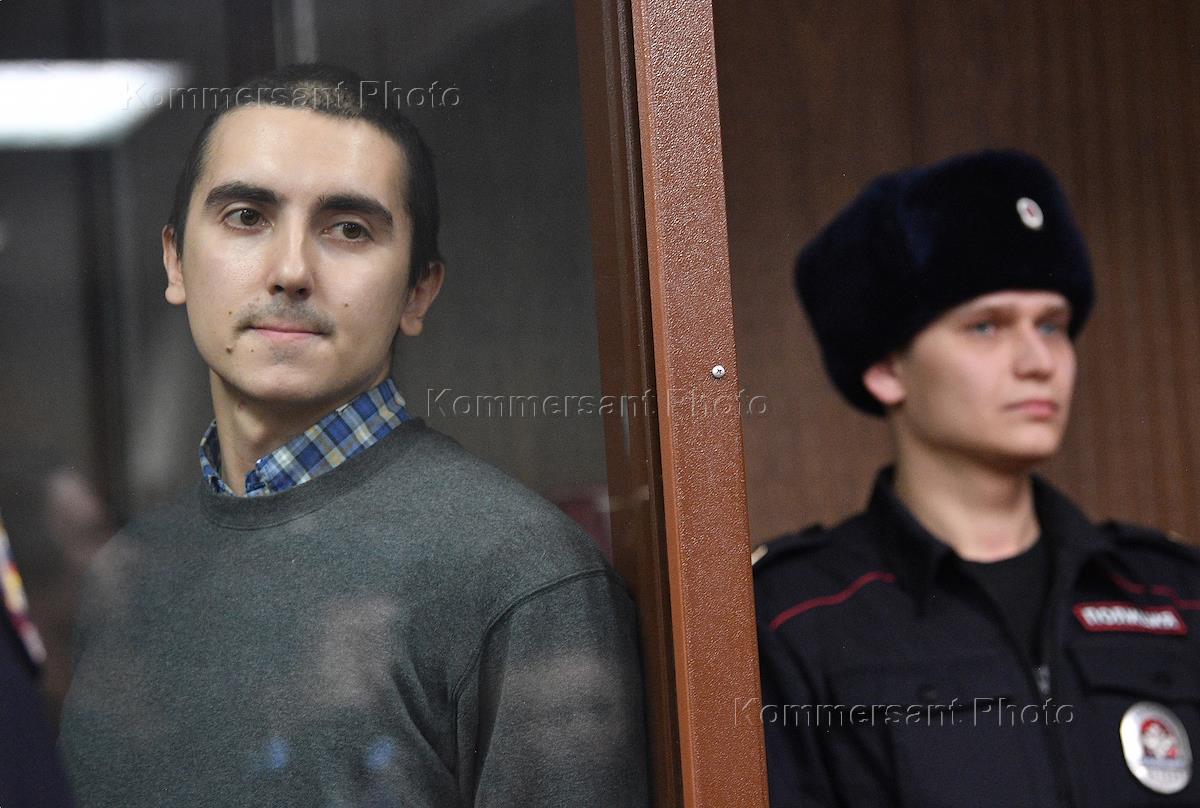 Участник несанкционированной акции 27 июля 2019 года в Москве Владимир Емельянов (слева), обвиняемый в применении насилия к представителю власти на акции, во время оглашения приговора в Мещанском районном суде.