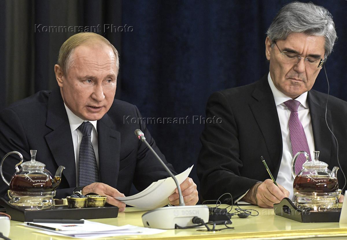 Рабочая поездка президента России Владимира Путина в Сочи. Встреча президента России Владимира Путина с представителями деловых кругов Германии в резиденции Бочаров Ручей. Президент России Владимир Путин (слева) и председатель правления "Сименс АГ" (Siemens AG) Джо Кэзер (справа) во время встречи.