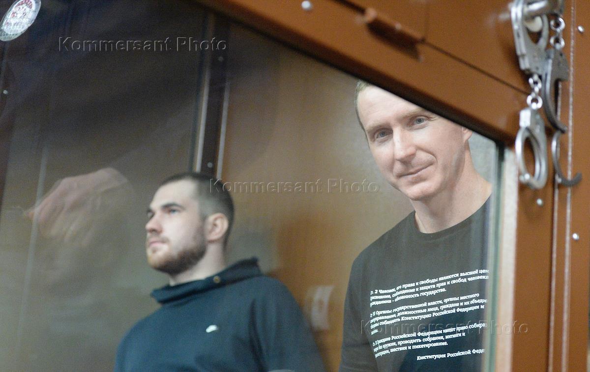Приговор по делу Егора Лесных, Максима Мартинцова и Александра Мыльникова, обвиняемых в применении насилия к полицейскому во время несанкционированной акции оппозиции "За честные выборы" 27 июля 2019 года, в Мещанском районном суде. Обвиняемые Максим Мартинцов (слева) и Егор Лесных (справа) во время заседания суда.