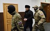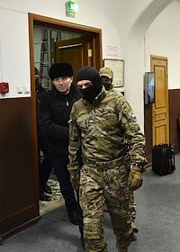 Обвиняемый по делу об убийстве начальника центра "Э" МВД по Ингушетии Ибрагима Эльджаркиева А. А. Картоев (в центре) перед началом заседания Басманного районного суда.