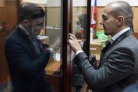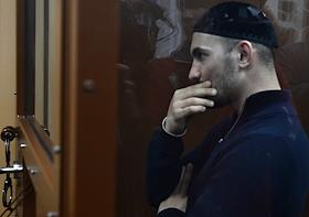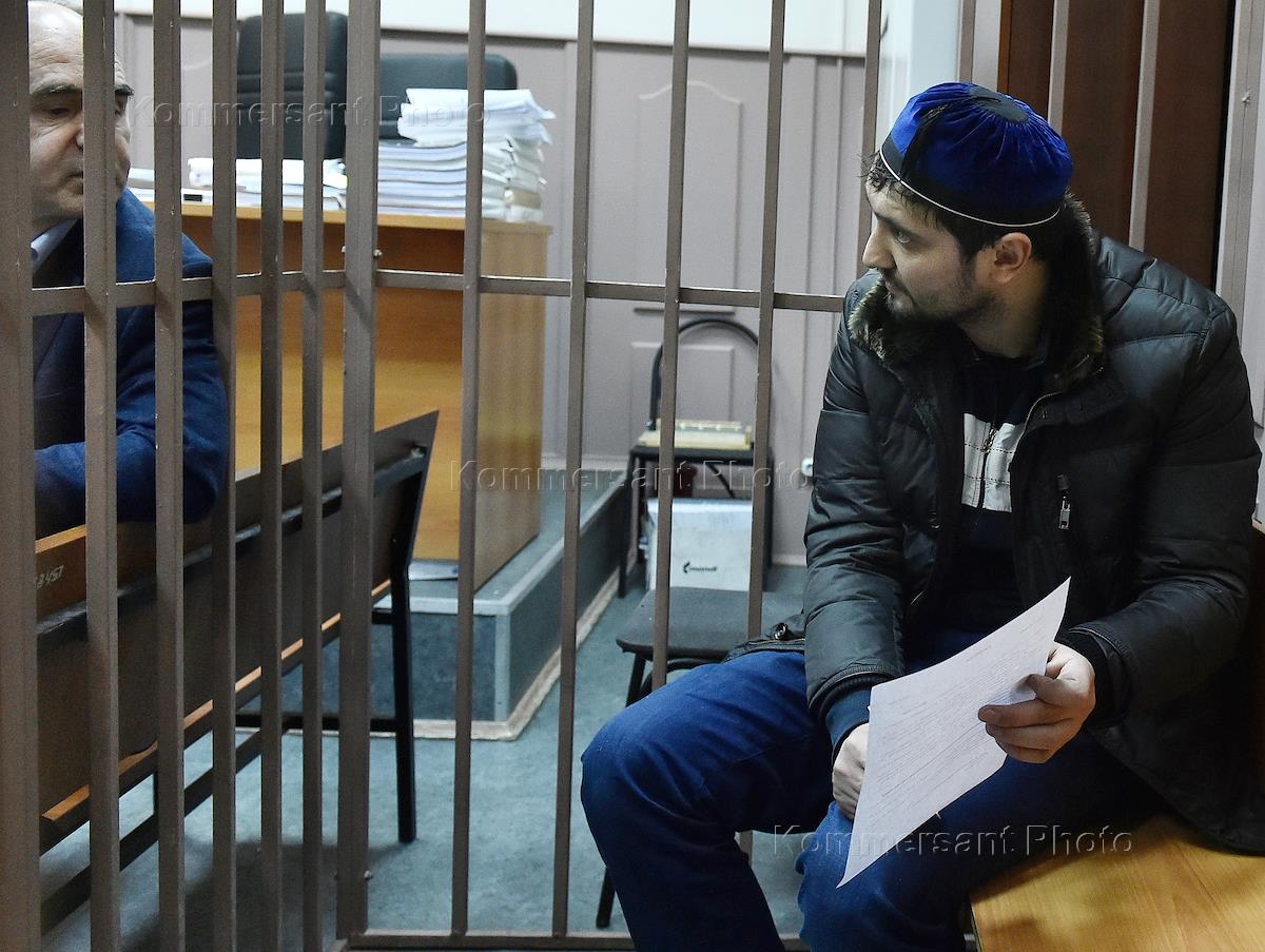 Обвиняемый по делу об убийстве начальника центра "Э" МВД по Ингушетии Ибрагима Эльджаркиева А. А. Картоев (слева) перед началом заседания Басманного районного суда.
