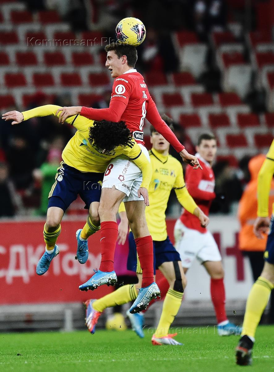 Russian Premier League (RPL). Russian Football Championship 2019-2020. Match between Spartak (Moscow) and Rostov (Rostov-on-Don) at the Otkritie Arena stadium. Rostov's Khoren Bayramyan and Spartak's Roman Zobnin (second from right) during the match.