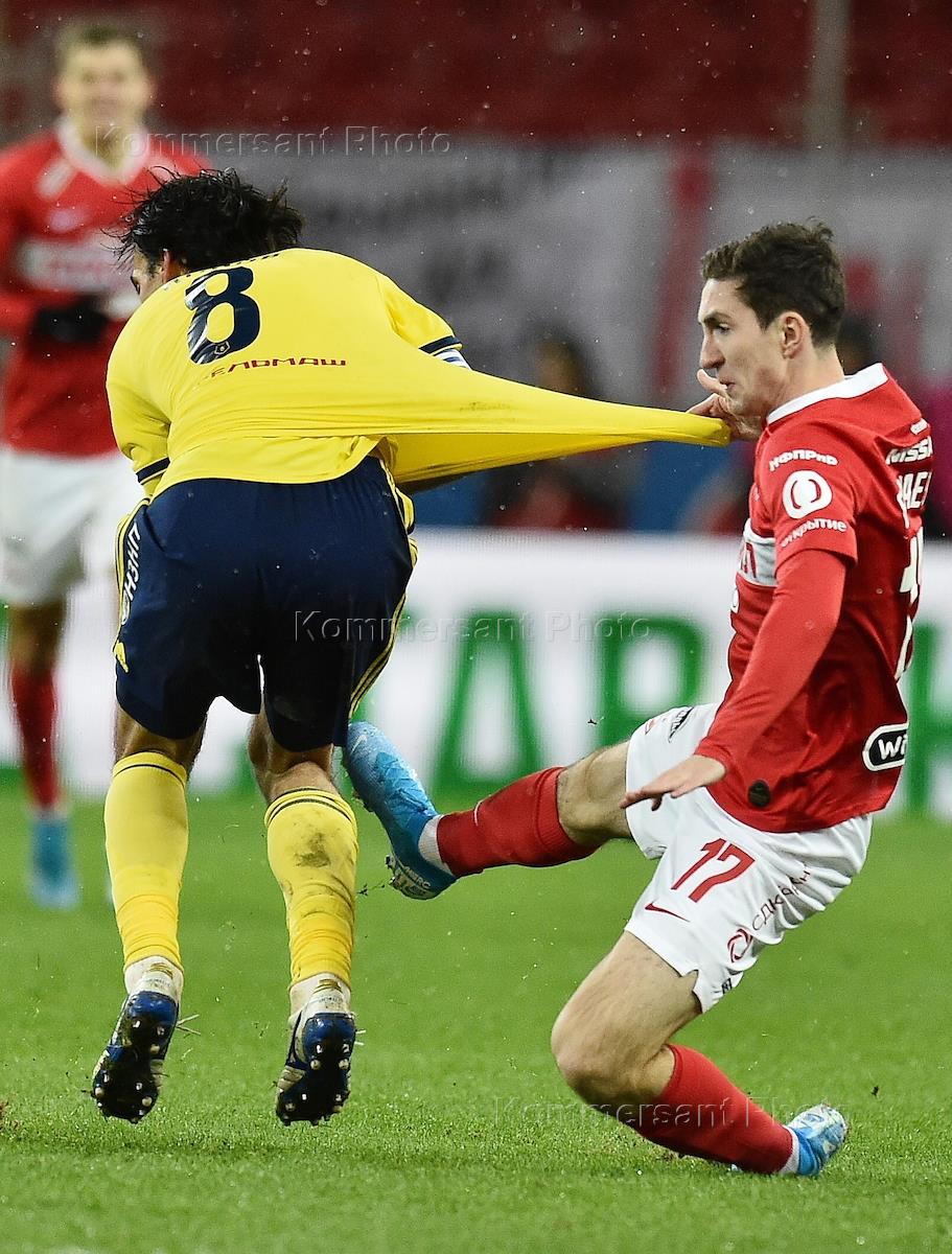 Российская Премьер-лига (РПЛ). 19-й тур РПЛ. Матч между командами "Спартак" (Москва) - "Ростов" (Ростов-на-Дону) на стадионе "Открытие Арена". Игрок команды "Спартак" Наиль Умяров (справа) и игрок команды "Ростов" Бактийор Зайнутдинов во время матча.