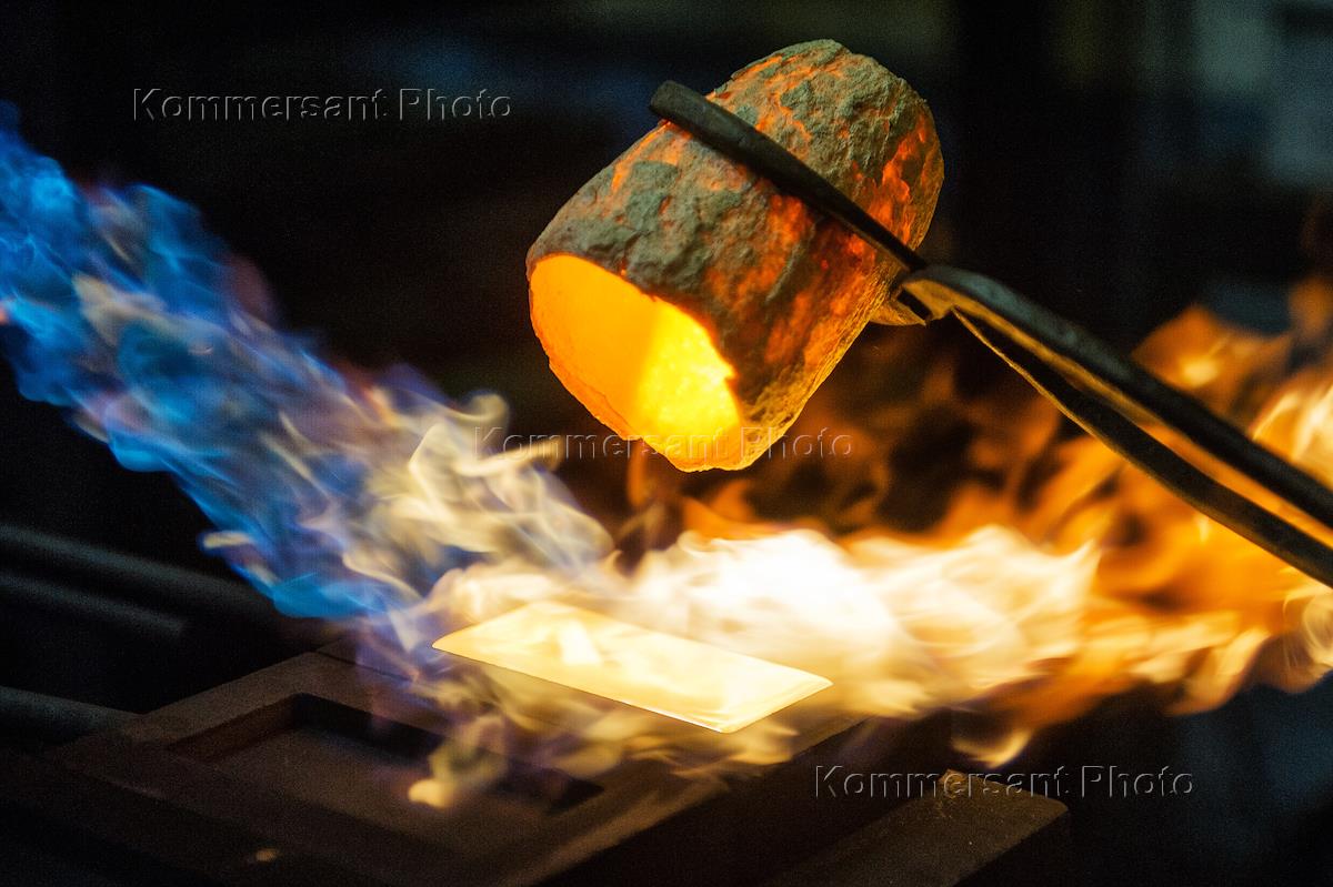 Плавка слитков серебра в литейном цехе Новосибирского аффинажного завода.